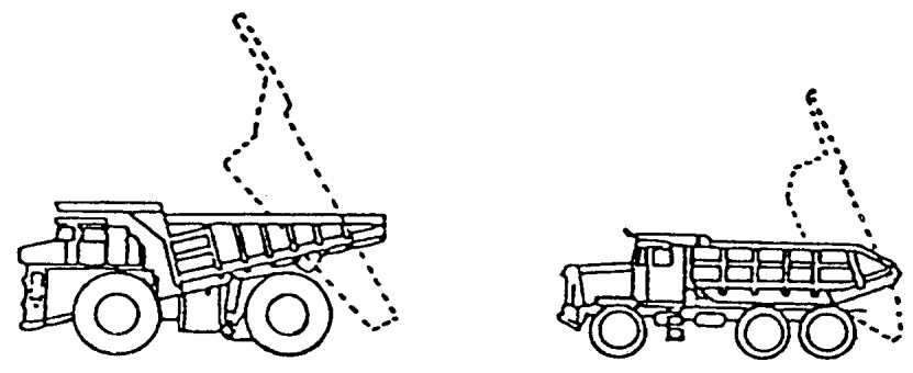 Следует отметить, однако, что некоторые типы автомобилей–самосвалов специально рассчитаны для работы на рудниках или в туннелях, например, такие, которые имеют кузова с нижней разгрузкой. Они обладают некоторыми из вышеуказанных характеристик, но у них нет кабины или выдвинутой вперед защитной части кузова.